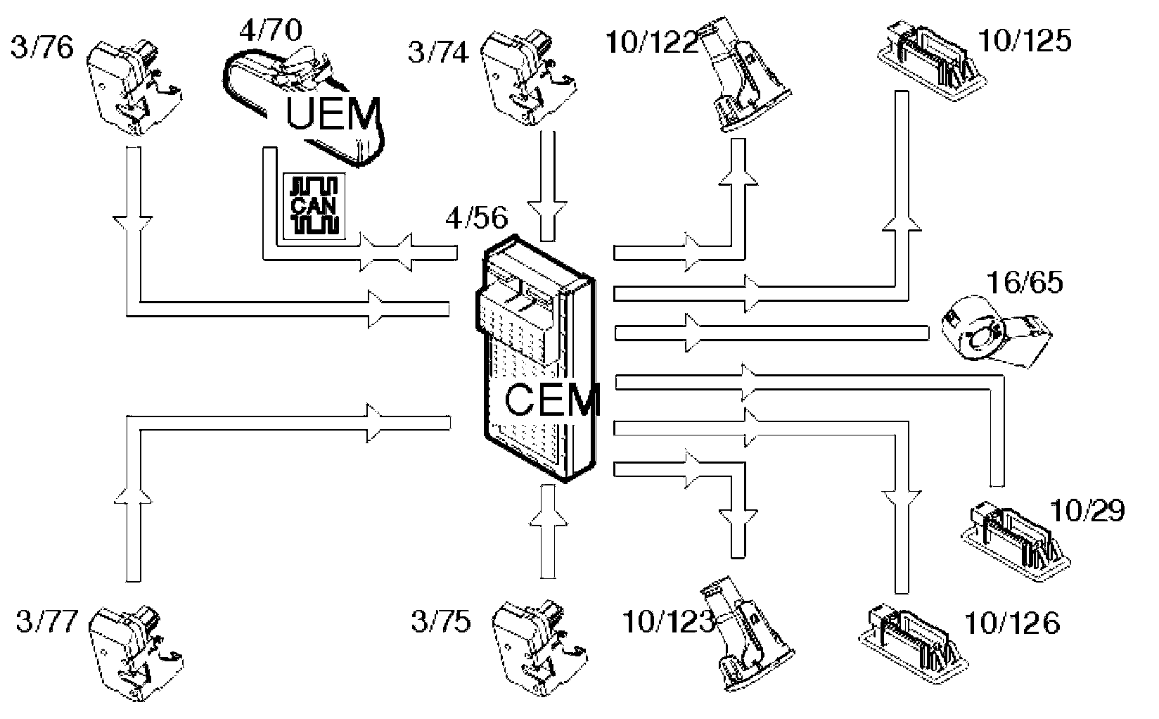 The courtesy lighting (10/122-123, 10/125-126), keyhole (16/65) and glove compartment lighting (10/29) are controlled via the central electronic module (CEM) (4/56). All other interior lighting is controlled by the upper electronic module (UEM) (4/70). The central electronic module (CEM) powers the lamps which it controls directly.