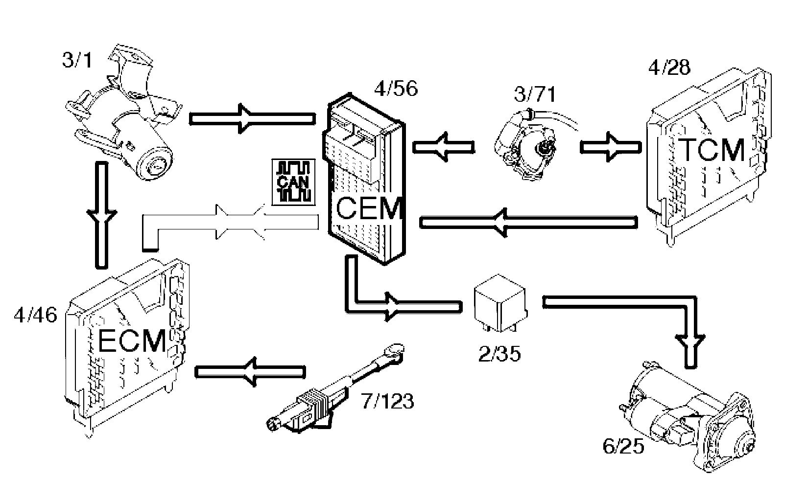 - For transmissions without clutch interlock, the central electronic module (CEM) (4/56) activates relay 2/35 and powers the solenoid in the starter motor (6/25).