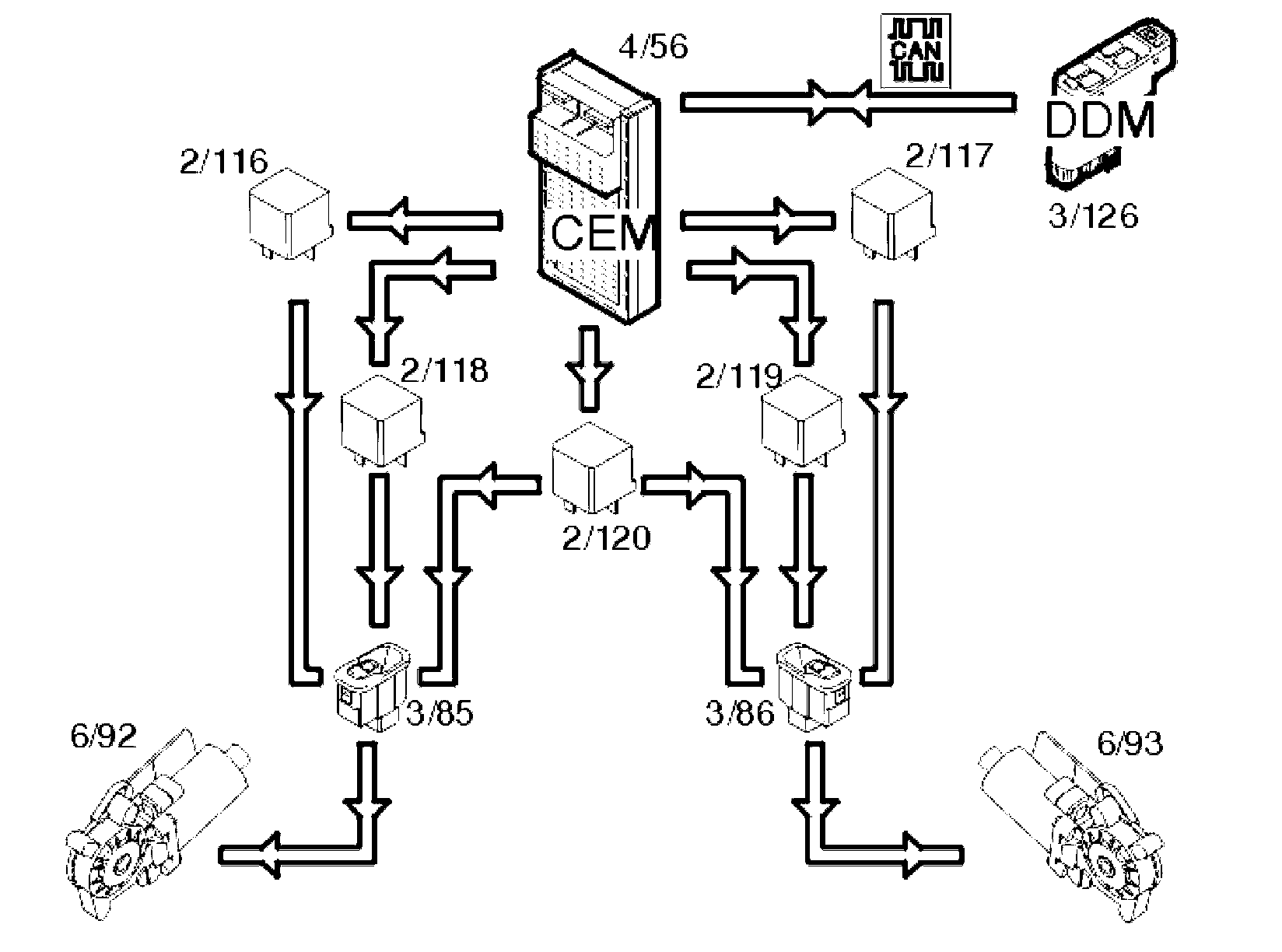 When the window lift mechanisms are operated from the driver's position, data is transmitted from the driver's door module (3/126) via the control area network (CAN) to the central electronic module (CEM) which transmits a signal to the correct relay.