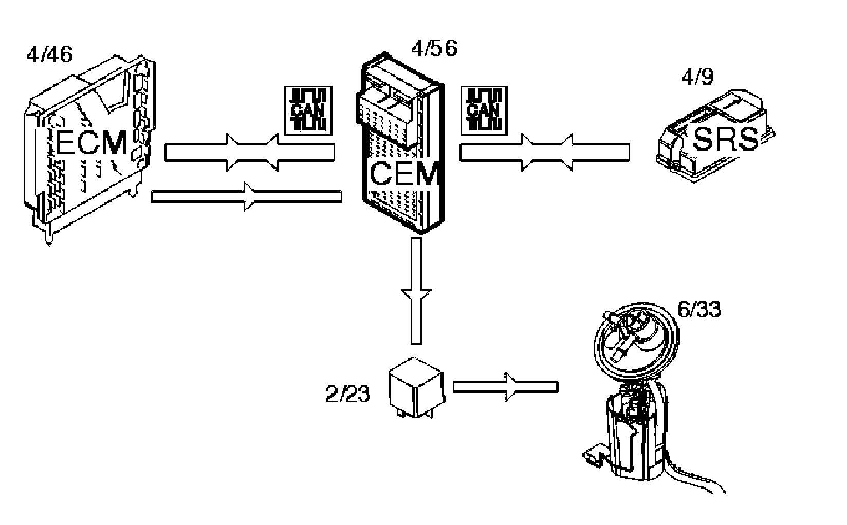 The central electronic module (CEM) (4/56) receives a request from the engine control module (ECM) (4/46) via the control area network (CAN) to start the fuel pump (FP) (6/33). The central electronic module (CEM) then activates the relay (2/23) which supplies the fuel pump with power.