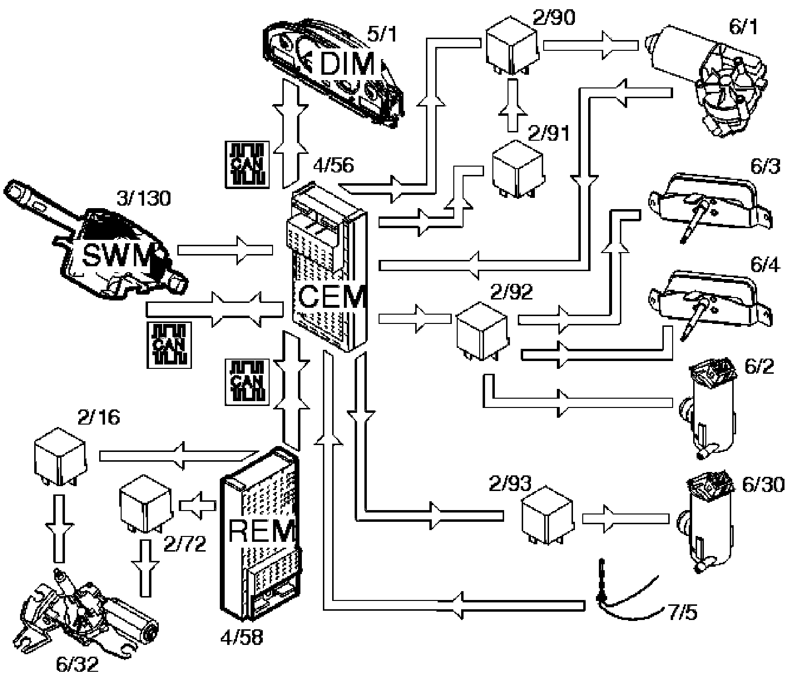 The central electronic module (CEM) also transmits a CAN signal to the driver information module (DIM) (5/1) to light the indicator lamp for high beam.