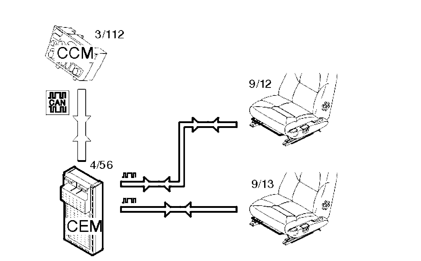 The climate control module (CCM) transmits information via the control area network (CAN) to the central electronic module (CEM) (4/56) to activate the seat heaters. The central electronic module (CEM) sends back a signal to the climate control module (CCM) to light the LED in the button. The central electronic module (CEM) compares the signal from the climate control module (CCM) with the programmed value for high/low temperature and transmits a pulsed signal to the control module for the seat heater (9/12-13) about the requested temperature. The number of pulses determines the power at which the control module will operate the seat heater. The control module also compares the value from the thermistor so that it can detect faults in the heater pad.