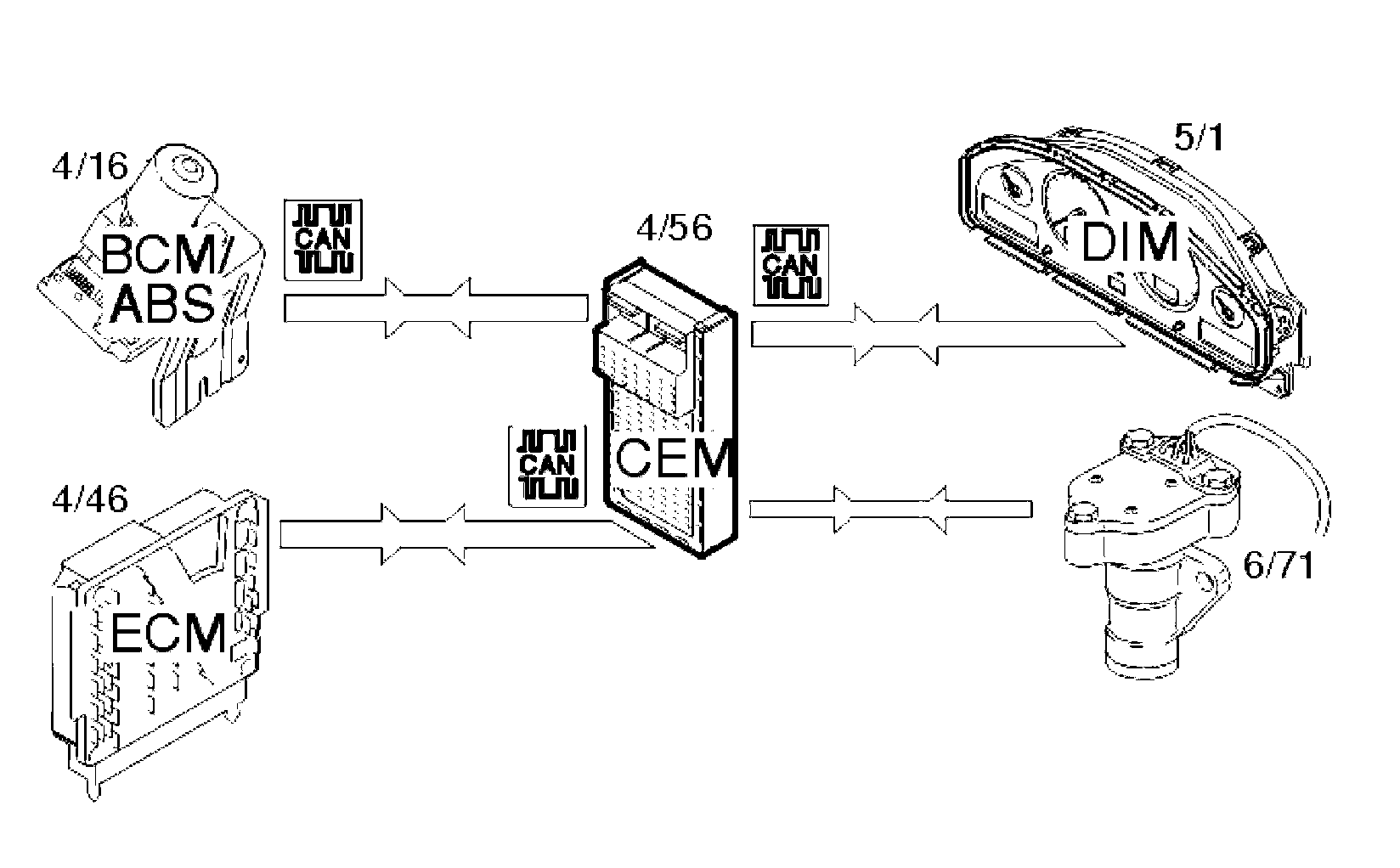 The central electronic module (CEM) (4/56) receives data from the engine control module (ECM) (4/46) via the control area network (CAN) that the engine is running and information from the ABS system (4/16) about the speed of the car. From model year 2001 the ABS module is called the brake control module (BCM). The central electronic module (CEM) then operates the stepper motor (6/71) via the four outputs to set the motor to the correct servo assistance level.