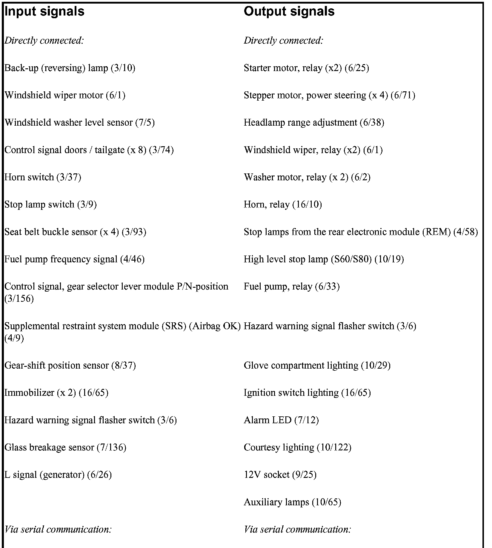 The above tables summarizes the input signals to and the output signals from the central electronic module (CEM). The signal types are divided into directly connected signals, serial communication and Controller area network (CAN) communication. The illustration displays the same information with the Volvo component designations.