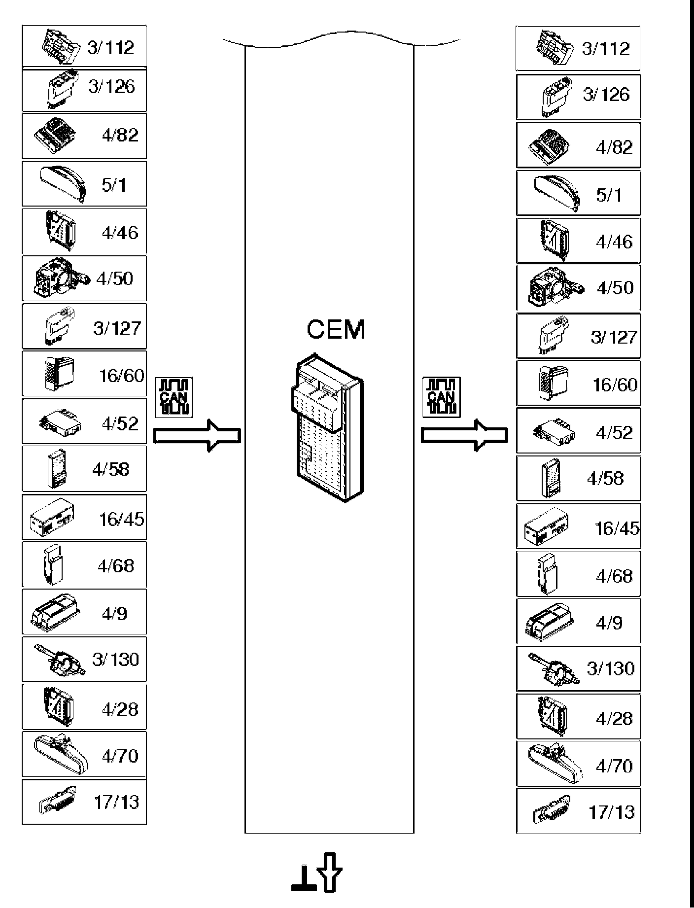 The central electronic module (CEM) controls the Controller area network (CAN) and acts as a bridge between the high and low speed networks and the data link connector (DLC). It also manages the following functions: