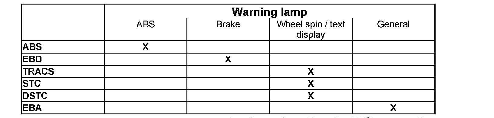 The control module checks calculations and all input and output signals via the built-in diagnostic functions. When the control module detects a fault certain functions are completely disengaged depending on the severity of the fault. At the same time a warning light comes on or a text message will be displayed depending on the fault (see table). When manually disengaging by activating the STC (stability and traction control) / DSTC (dynamic stability and traction control) switch (pressed in for approximately 1/2 second) all functions are disengaged except for the ABS, Electronic Brake force Distribution, emergency brake assistance and vehicle speed signal. In the event of the temperature of the brake discs being too high traction control is switched off to prevent damaging the brake caliper and brake discs. The general warning lamp is only lit by the Brake Control Module (BCM) in the event of faults which affect the emergency brake assistance function. However it can be lit by other control modules which have been affected by faults in the brake control system.