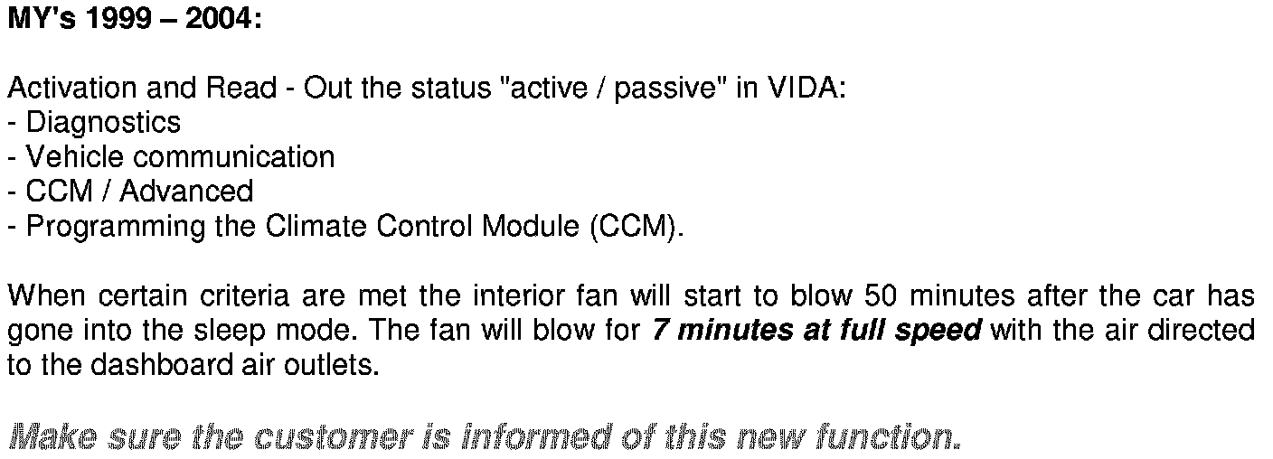 MY 2005 and later it is only necessary to activate / deactivate Afterblow one time per vehicle. If ANY new software is downloaded the Afterblow function will stay activated.