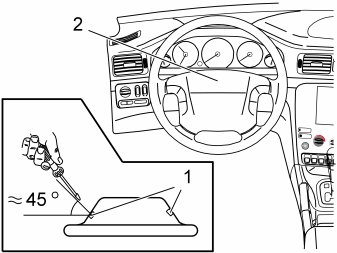- Carefully install the new steering wheel by holding it straight and aligning the locating pins (1) on the contact reel.