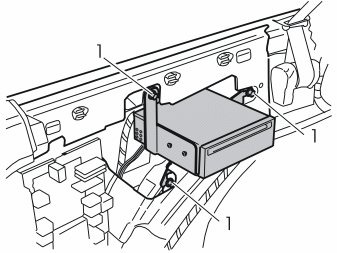 - Screw the DVD reader into place with the bracket above the left-hand rear wheel well. Use the three screws (1) from the kit. Ensure that none of the wiring is caught or trapped.