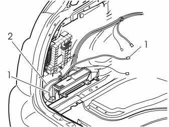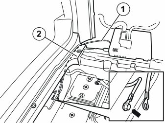 - Lift the panel and insert the ground lead of the pre-routed cable harness (1) into the gap between the floor support (2) and the panel and forwards to the ground terminal behind the battery.