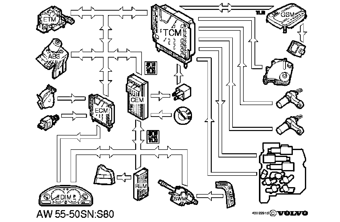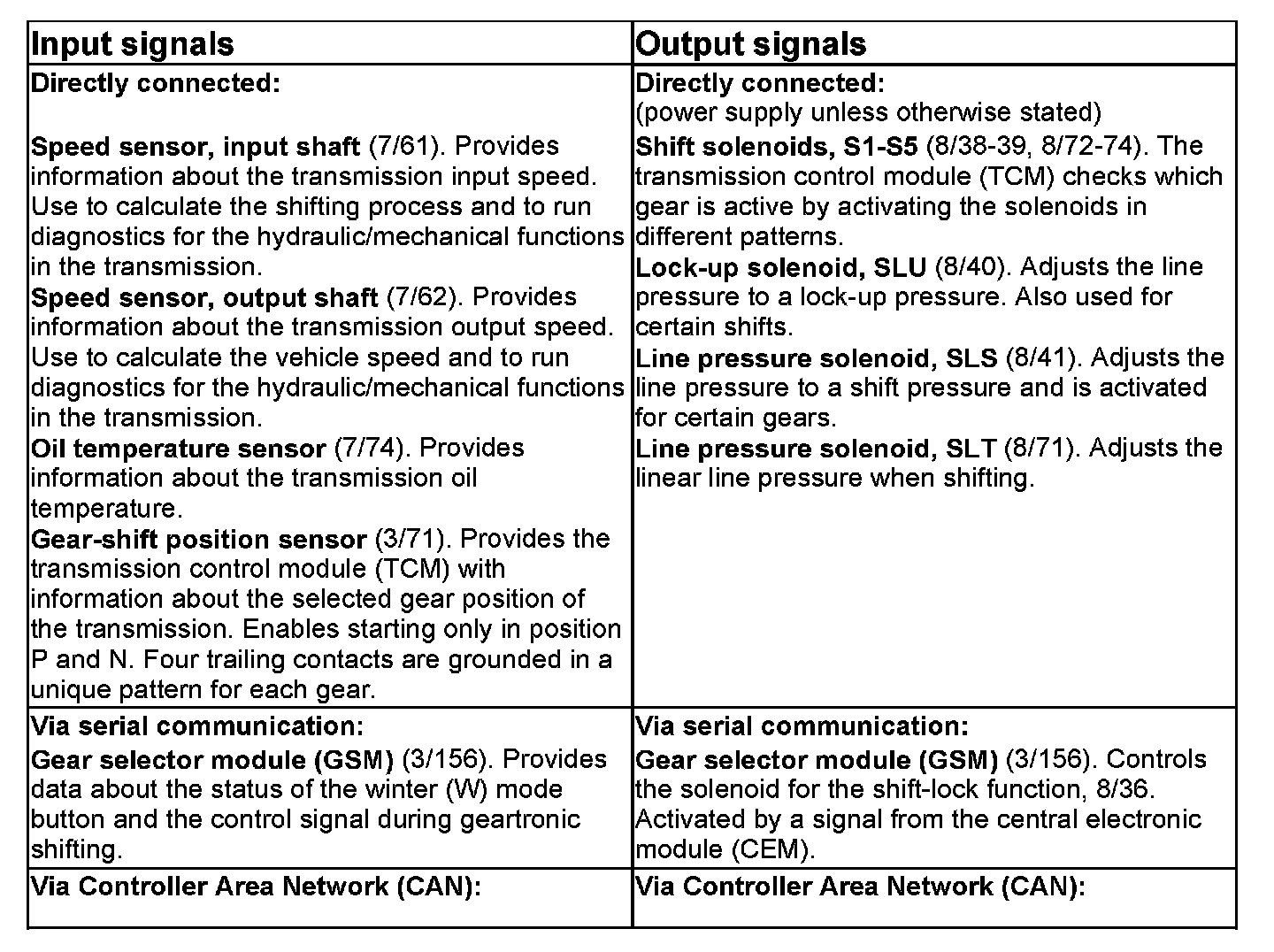 The table summarizes the input signals to and output signals from the Transmission Control Module (TCM). The signal types are divided into directly connected signals, serial communication and Controller area network (CAN) communication. The following illustration displays the same information with the Volvo component designations.