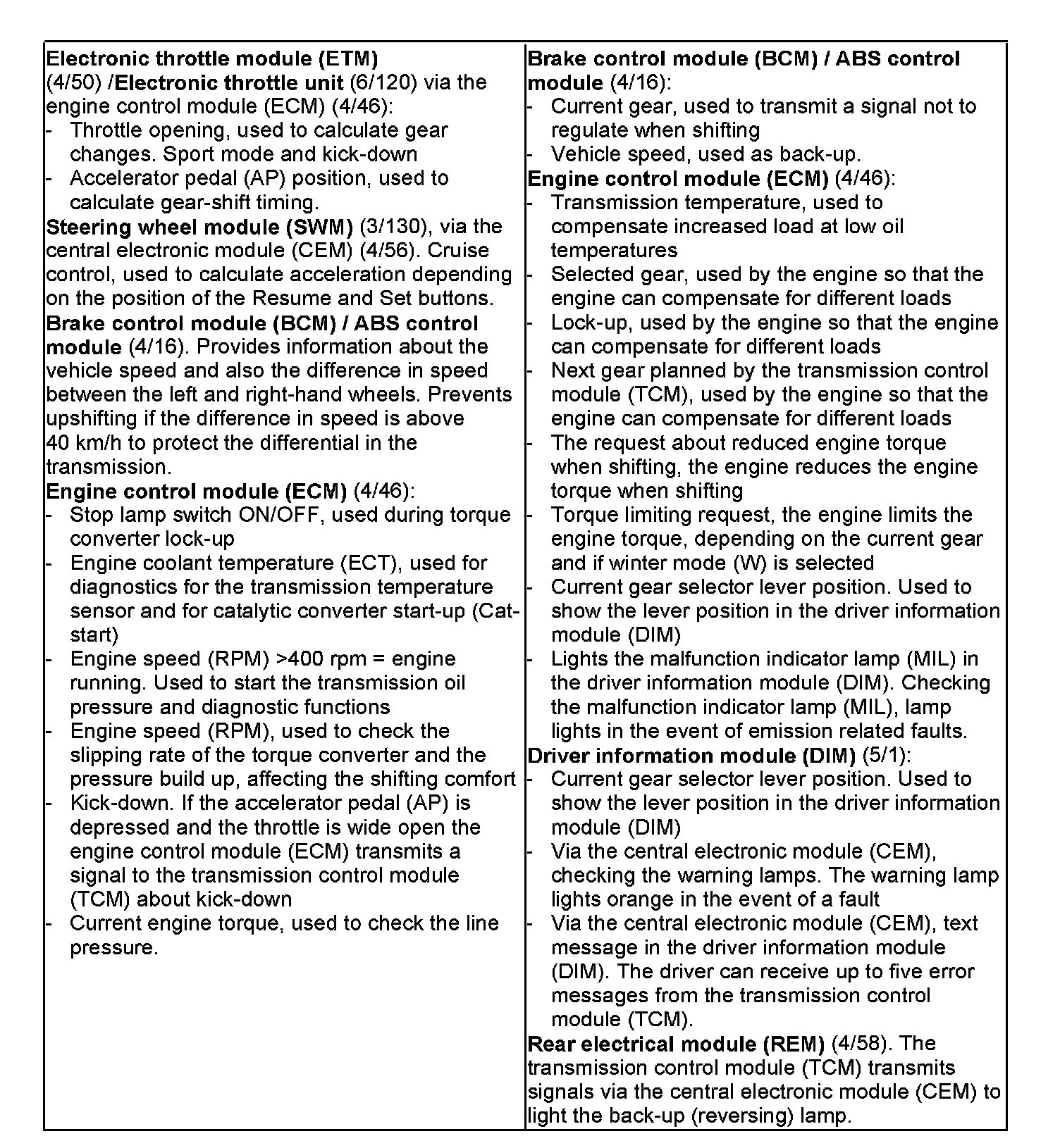 The Transmission Control Module (TCM) receives information about the desired gear position and driving mode from the driver. In conjunction with the signals from a number of sensors in the transmission and the engine control system, unlike with a purely hydraulically controlled transmission, this allows the control module to calculate the optimal shifting points and engagement of lockup. The control module allows for small changes in the operating conditions and adapts the various transmission functions to ensure that the correct gear is always selected in relation to the driving mode selected by the driver.