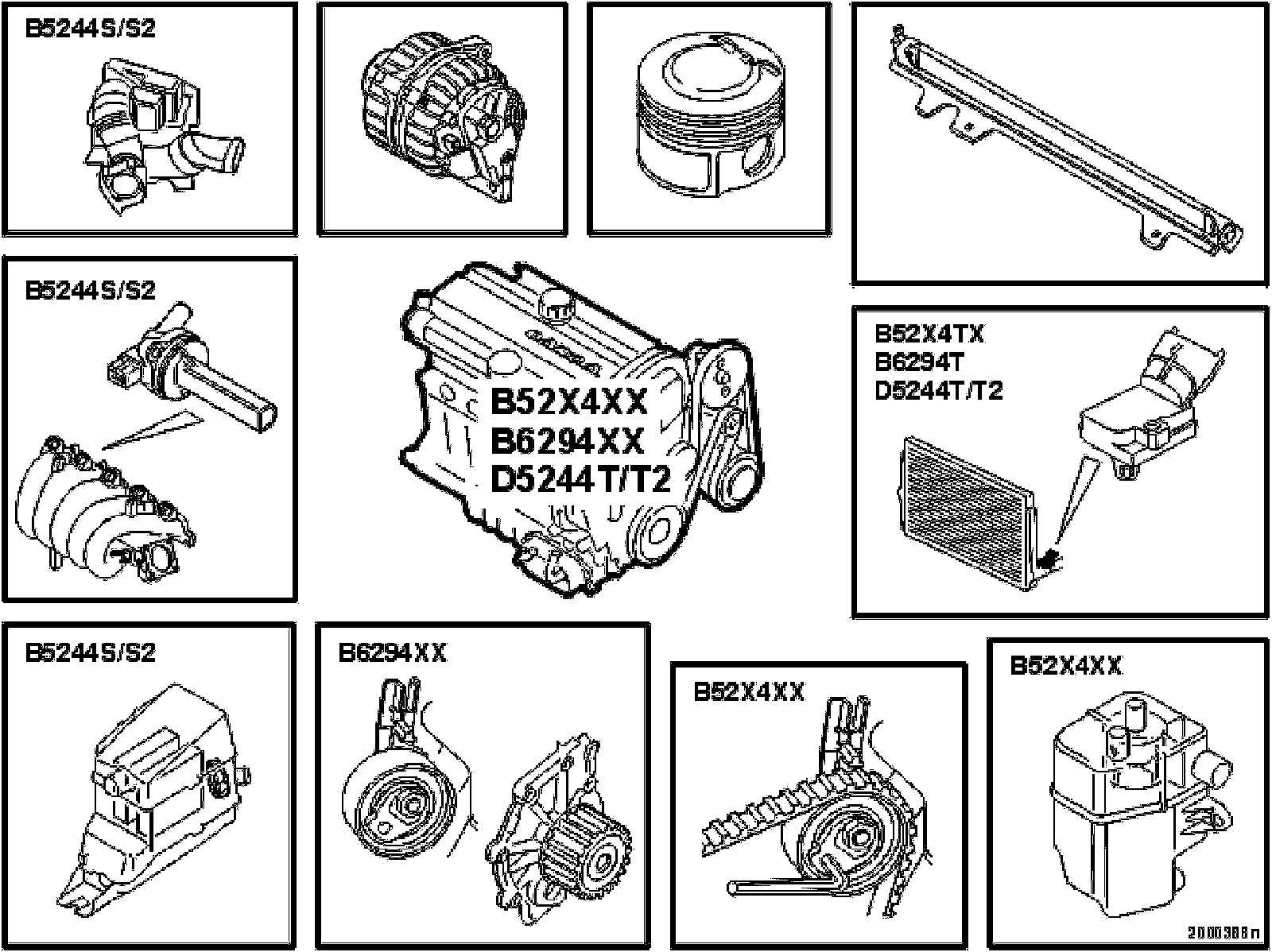 All engines (except B5204TX, B5234TX and B5244TX) have pistons with the mantles coated with graphite. This reduces noise and lowers the friction between the piston and the cylinder, particularly when cold starting and under large loads at low engine speeds. Also improves resistance to scoring.