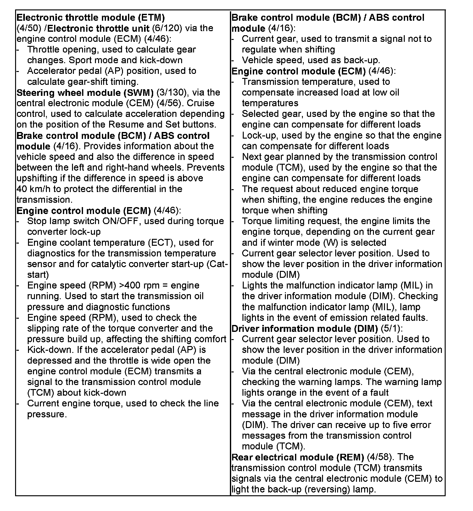 The transmission control module (TCM) receives information about the desired gear position and driving mode from the driver. In conjunction with the signals from a number of sensors in the transmission and the engine control system, unlike with a purely hydraulically controlled transmission, this allows the control module to calculate the optimal shifting points and engagement of lock-up. The control module allows for small changes in the operating conditions and adapts the various transmission functions to ensure that the correct gear is always selected in relation to the driving mode selected by the driver.