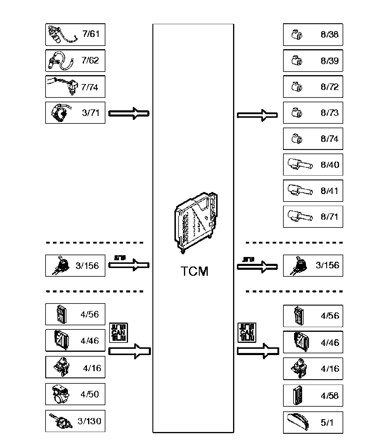 - Transmission control module (TCM) - Controls activation and deactivation of the solenoids by processing the signals from components such as the transmission input and output speed sensors and the temperature sensor. Also stores adaptive data as well as diagnostic trouble codes (DTCs) and frozen values for diagnostics