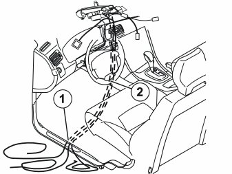 - Clamp the three cable harnesses at the existing cable harness, at point (1) and at the strut (2) in the centre console. Use tie straps from the kit.