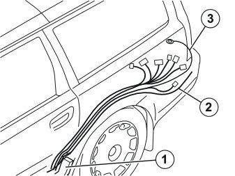 - Route the cables along the existing cable harness (2) along the top of the wheel housing and position them as illustrated.