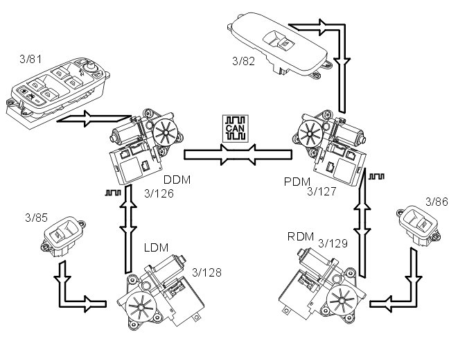 The window is operated by the switch in the control panel (3/81). The motor for the power window on the driver's side is controlled directly from the driver door module (DDM) (3/126). The motor for the power window on the passenger side is controlled via controller area network (CAN) communication from the driver door module (DDM) to the passenger door module (PDM) (3/127). The signals for operating the rear window on the driver's side are transmitted from the driver door module (DDM) to the rear window using LIN-communication. The signals for operating the rear window on the passenger side are transmitted from the driver door module (DDM) via the controller area network (CAN) to the passenger door module (PDM) and then to the rear window using LIN-communication.