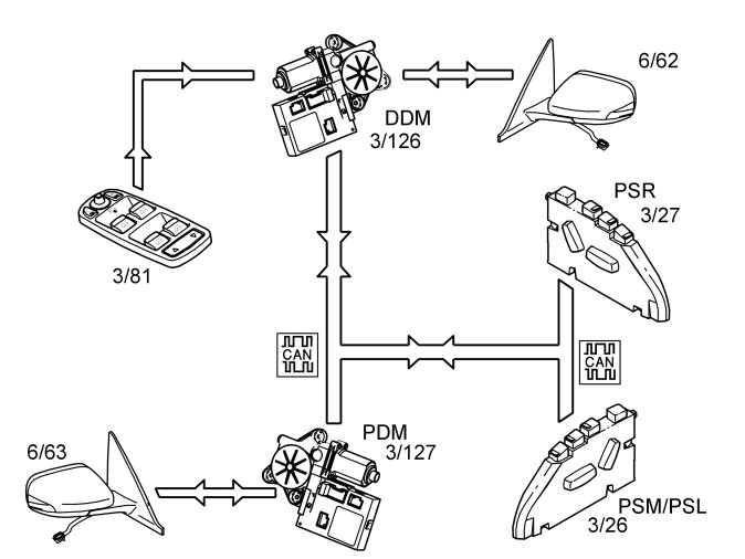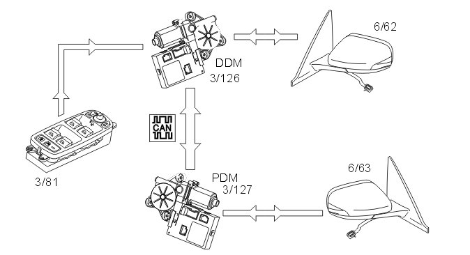 The position of the mirror is controlled using buttons on the control panel on the driver's side (3/81). The driver door module (DDM) (3/126) transmits a signal directly to the mirror on the driver's side (6/62). When adjusting the mirror on the passenger side (6/63), a signal is transmitted via the driver door module (DDM) to the passenger door module (PDM) (3/127) on the controller area network (CAN). The passenger door module (PDM) transmits the signal to the door mirror.