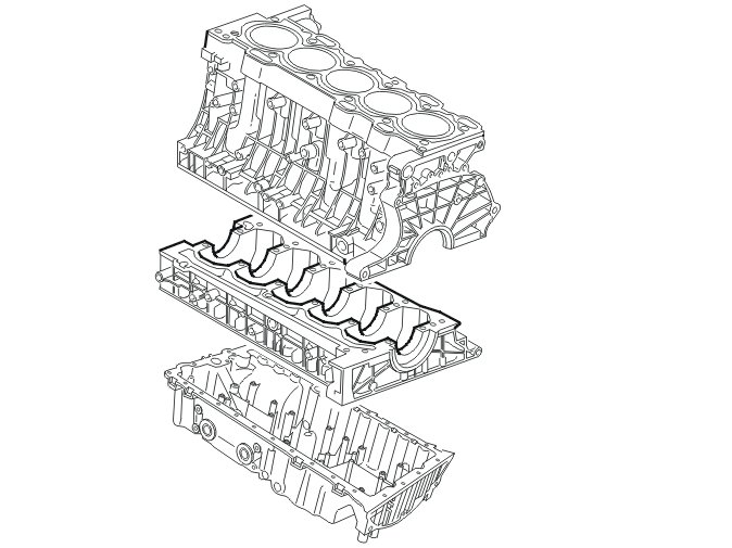 The engine block is divided into three sections, the cylinder block, intermediate section and oil pan. The mating flange between the cylinder block and intermediate section is in the center line of the crankshaft.
