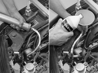 Flush the oil cooler via the hose connected to the upper pipe sleeve for the oil cooler. Use automatic transmission fluid P/N 116 1540-8 (1 liter). Use an oil syringe or a funnel.