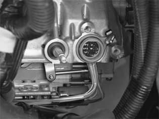 Install the cable harness for the transmission. Ensure that the guide for the connector comes between the lugs on the transmission. Ensure that the cable harness is secured to the holders on the control system.