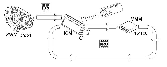 The central electronic module (CEM) transmits both signals to the infotainment control module (ICM) (16/94) via the low speed side of the Controller area network (CAN). The vehicle speed signal is transmitted from the central electronic module (CEM) to the infotainment control module (ICM). The infotainment control module (ICM) transmits in turn the signals to the multimedia module (MMM) on the MOST network.