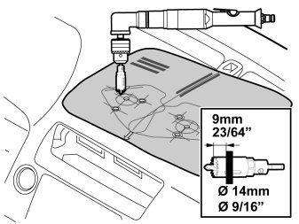 - Drill for the connection of the connector. Drill through all layers of the dashboard. Use a 25 mm (1")drill stop.