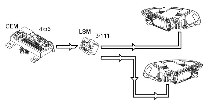 Depending on the position of the knob in the light switch module (LSM) (3/111), the module transmits a request to the central electronic module (CEM) to switch on low beam. Central electronic module (CEM) (4/56) supplies power to the low beam directly via an output.