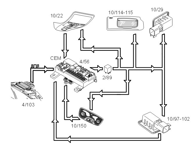 The interior roof lighting and the courtesy lighting is powered by the central electronic module (CEM) via the relay for courtesy lighting (2/89). The interior roof lighting and the courtesy lighting can be dimmed when the central electronic module (CEM) activates/ deactivates general lighting. This is because the return cable from the interior roof lighting to the Central Electronic Module (CEM) can be controlled.
