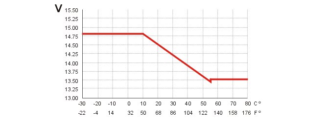 To charge the battery optimally the central electronic module (CEM) calculates the output voltage from the generator (GEN) using the temperature of the battery. The alternator control module (ACM) controls the output voltage, depending on the control from the central electronic module (CEM). See the illustration above. In some driving conditions for example, the engine control module (ECM) is able to affect generator (GEN) control, whereby the output voltage will deviate from the above.