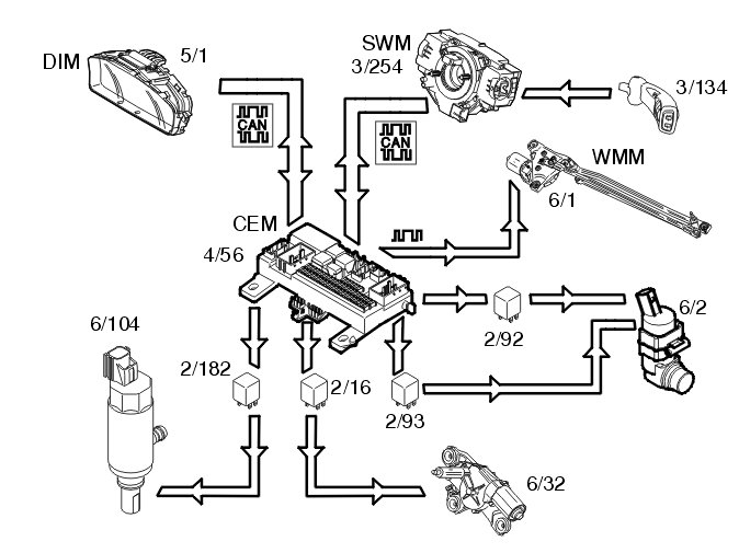 The right-hand control stalk (3/134) is moved downwards through three positions to operate the windshield wipers. The steering wheel module (SWM) (3/254) transmits information via the control area network (CAN) to the central electronic module (CEM) (4/56) about the selected position. The central electronic module (CEM) transmits the information on to the wiper motor module (WMM) (6/1) via serial communication.
