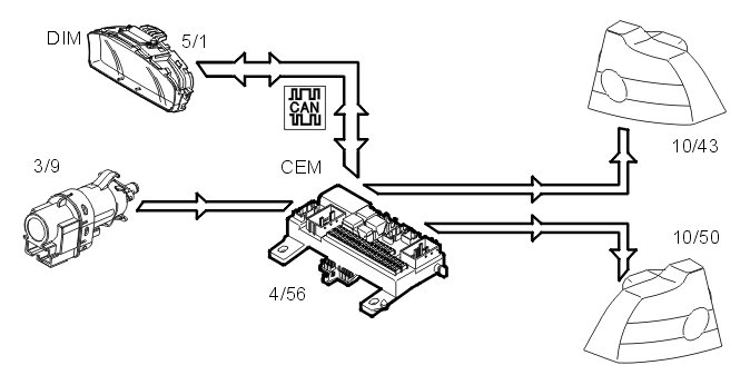 The central electronic module (CEM) measures the power consumption on the output which powers the rear fog lamps. In this way information about lamp status can be obtained. In the event of a fault, the central electronic module (CEM) transmits information via the Control area network (CAN) to the driver information module (DIM) which displays a text message.
