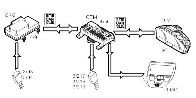 The seat belt reminder (10/41) is activated when the central electronic module (4/56) receives a signal from the supplemental restraint system module (SRS) (4/9), via the control area network (CAN), which indicates that the seat belt is not fastened despite someone sitting in the front seat. The three seat belt buckles in the rear seat (3/217-219) have sensors which are directly connected to the central electronic module (CEM). If a belted passenger opens the seat belt while the vehicle is in motion, the central electronic module (CEM) will activate the seatbelt not fastened indicator.