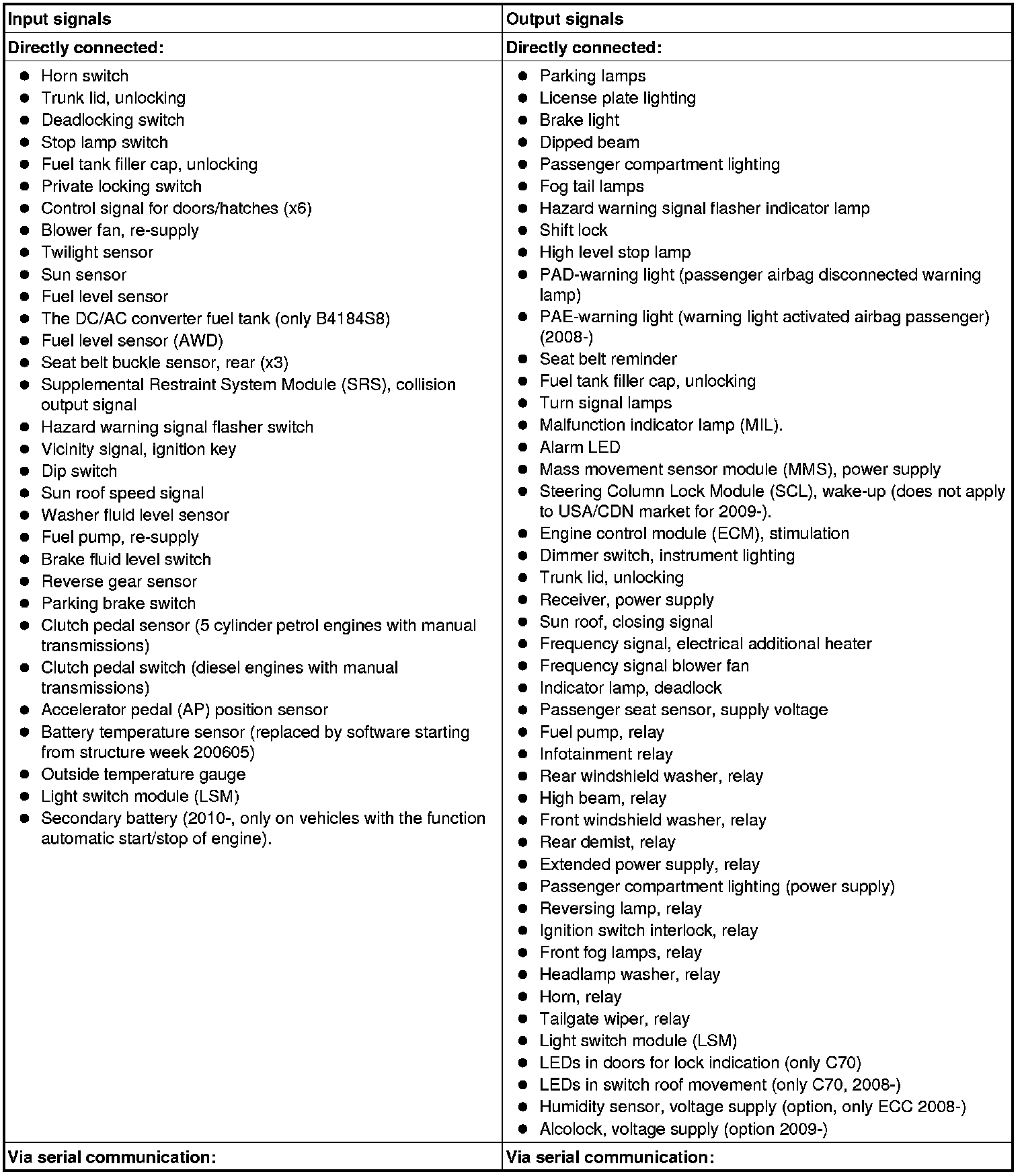 The table below summarizes the input signals to and output signals from the central electronic module (CEM). The signal types are divided into directly connected signals, serial communication and controller area network (CAN) communication.