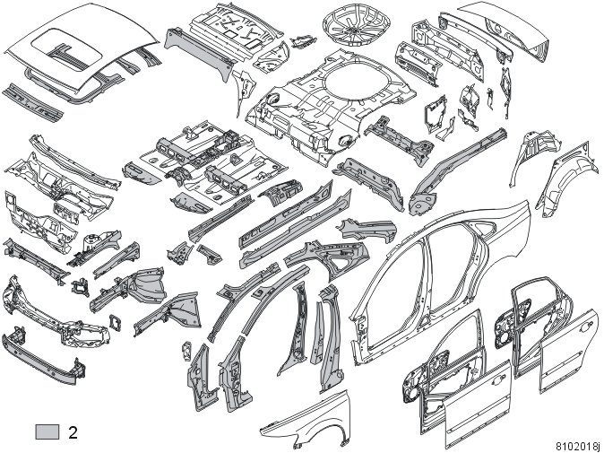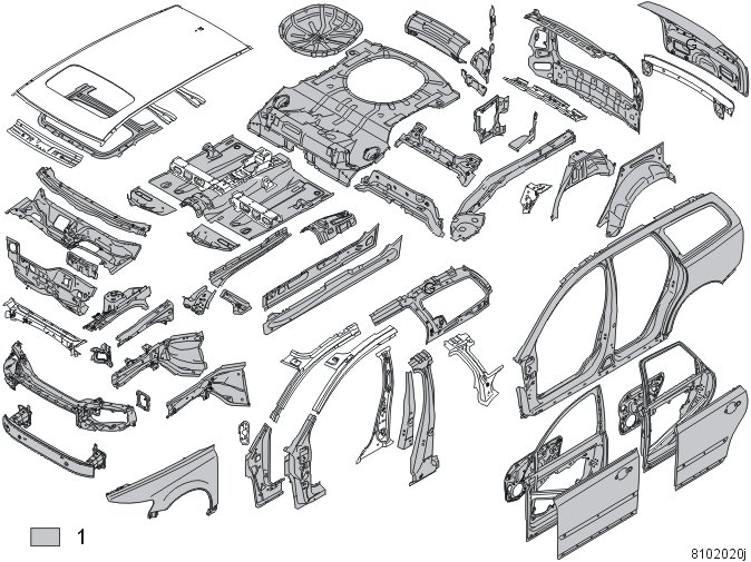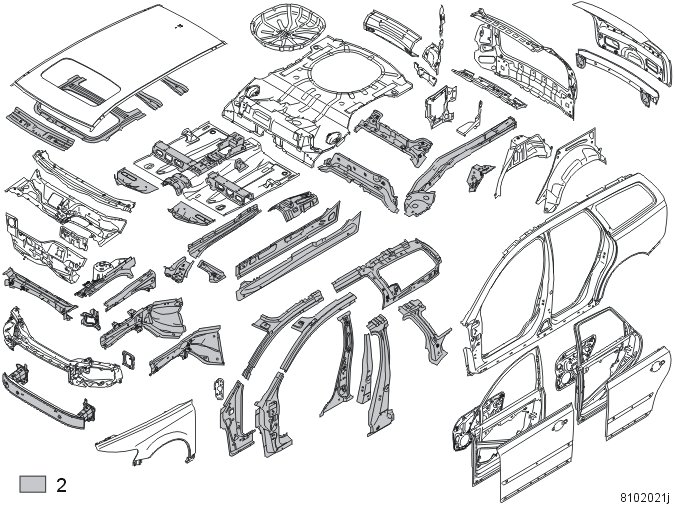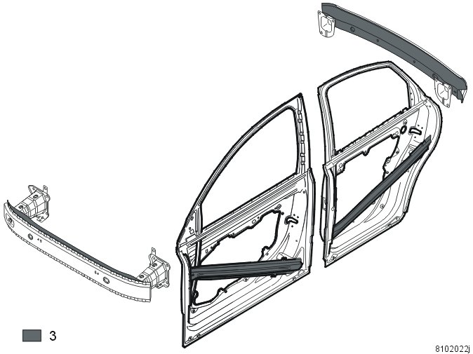 The dark gray sections (3) in the illustration are made of boron steel. Boron steel has a very high yield and breaking point. The yield point is approximately 1350 N/mm2and particular attention must therefore be paid to boron steel during repair work.