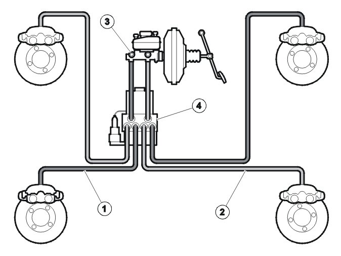 Two brake pipes run from the master cylinder (3) to the brake control module (BCM) (4), where the brake pipes then branch to the wheel brakes.