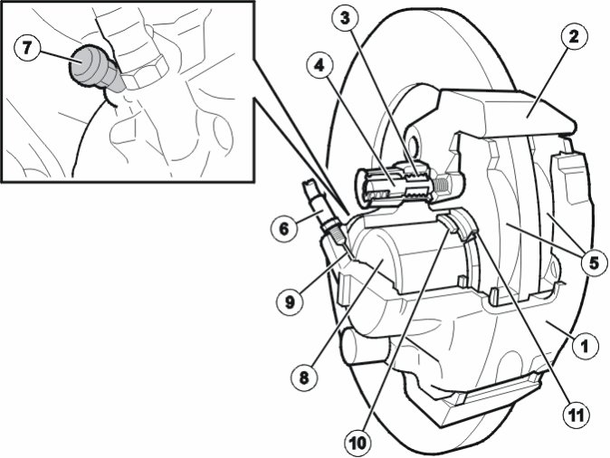 The brake caliper (1) comprises two halves joined with screws, positioned over the brake disc. The caliper grips across the disc brake and slides in the holder on two sliding pins (4). The sliding pins are greased and protected with a rubber bushing (3). The braking force from the brake pads (5) is absorbed via the holder (2), which transfers the force to the spindle.