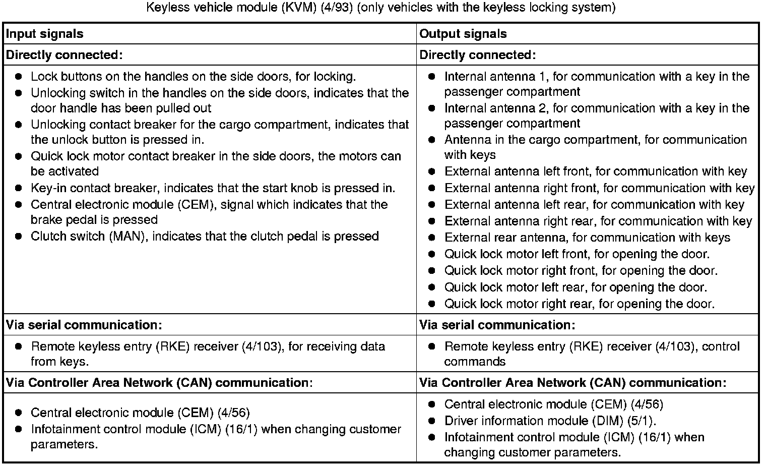 The tables below summarize the input and output signals to the units in the system for the immobilizer. The signal types are divided into directly connected signals, serial communication and controller area network (CAN) communication.
