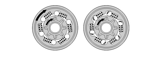 The left-hand illustration displays the normal position. The starter motor, connected to the outer section drives the pinion (inner section) by means of the rollers, which then lock.