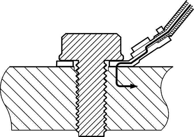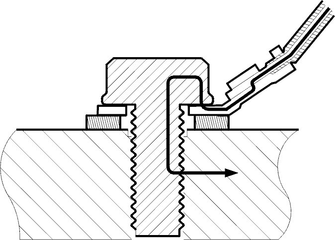 The three figures show grounding point bolted joint for engine block (the left figure) and body (the right figure),as well as the current's path in the joints.
