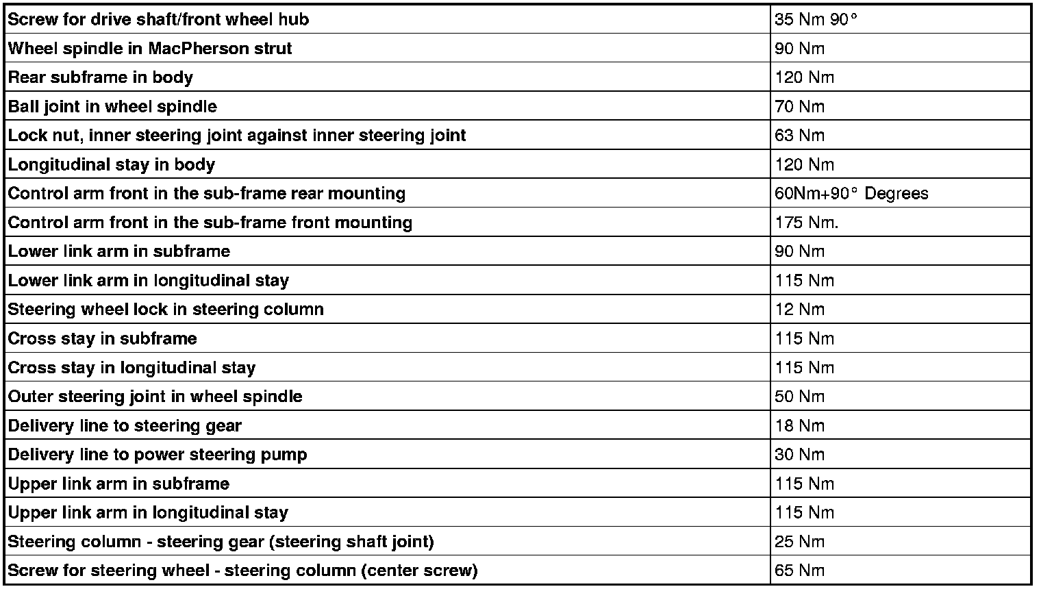 See the table below to find the tightening torques for components not included in the summary.