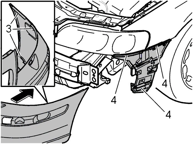 Align the lugs (3) on the bumper in the channels (4) on the slide mounting. Press at the top so that the lugs secure.