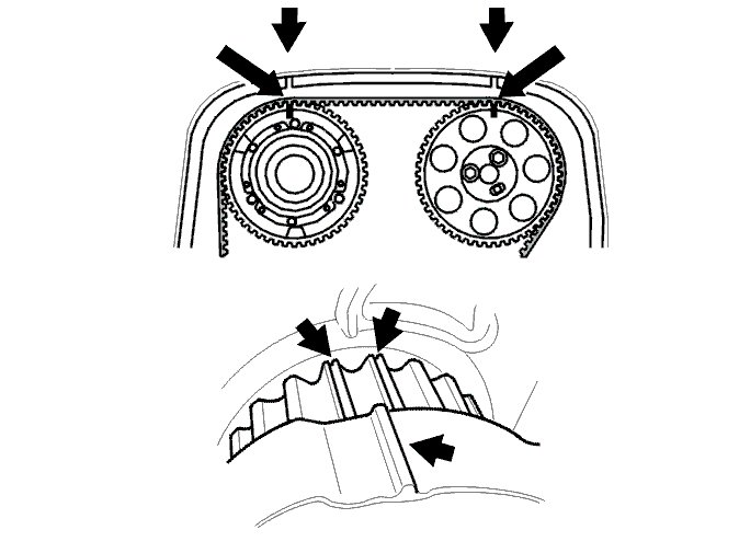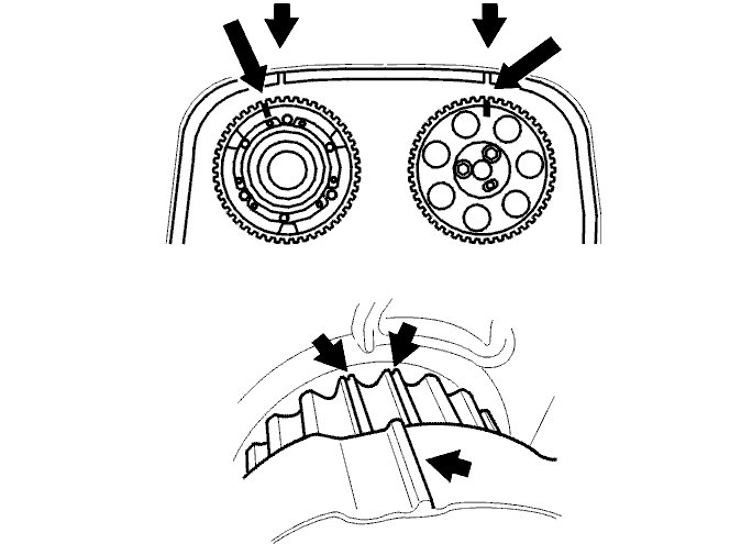 Check that the markings on the timing gear pulleys and the upper timing cover correspond.