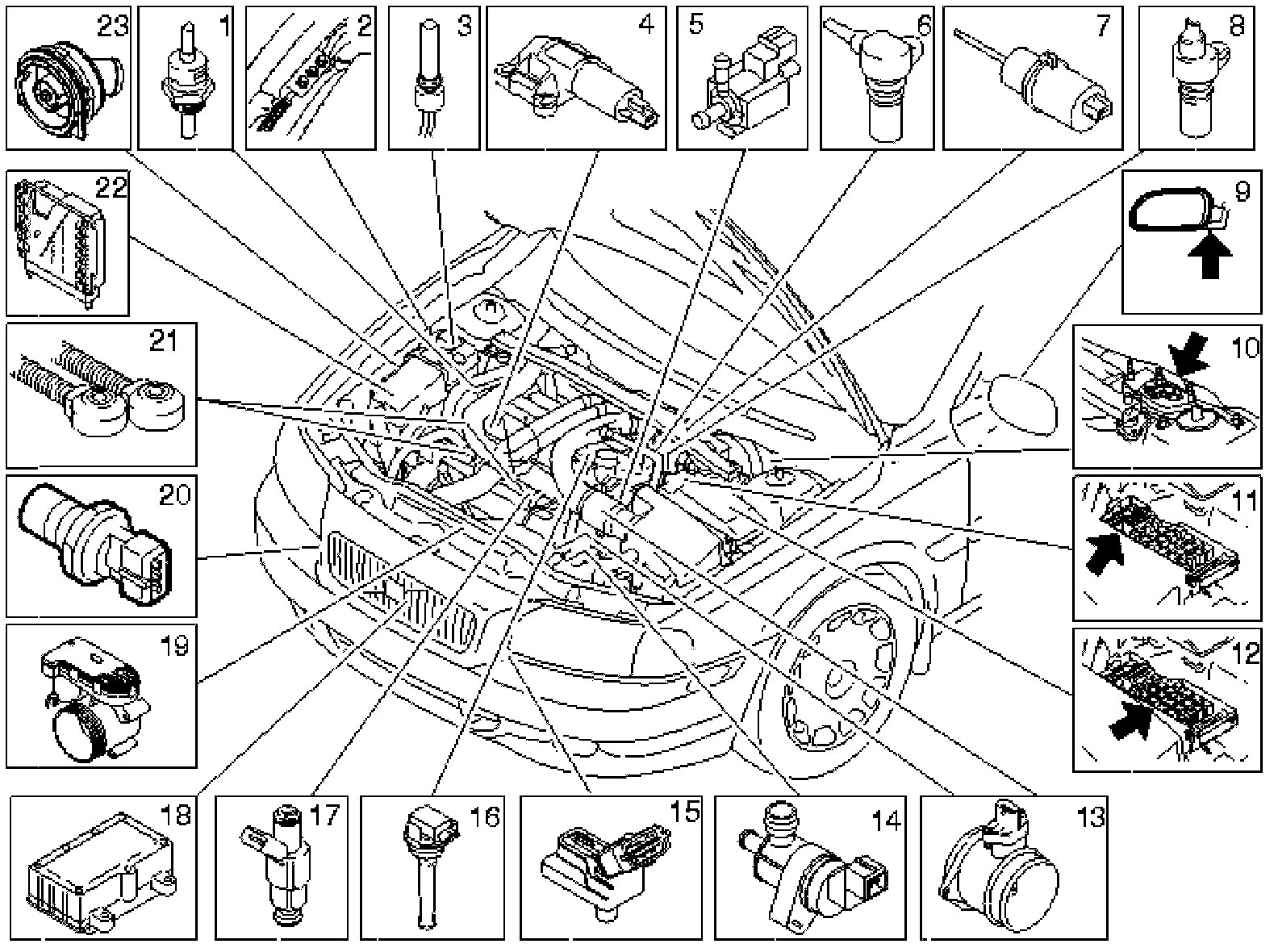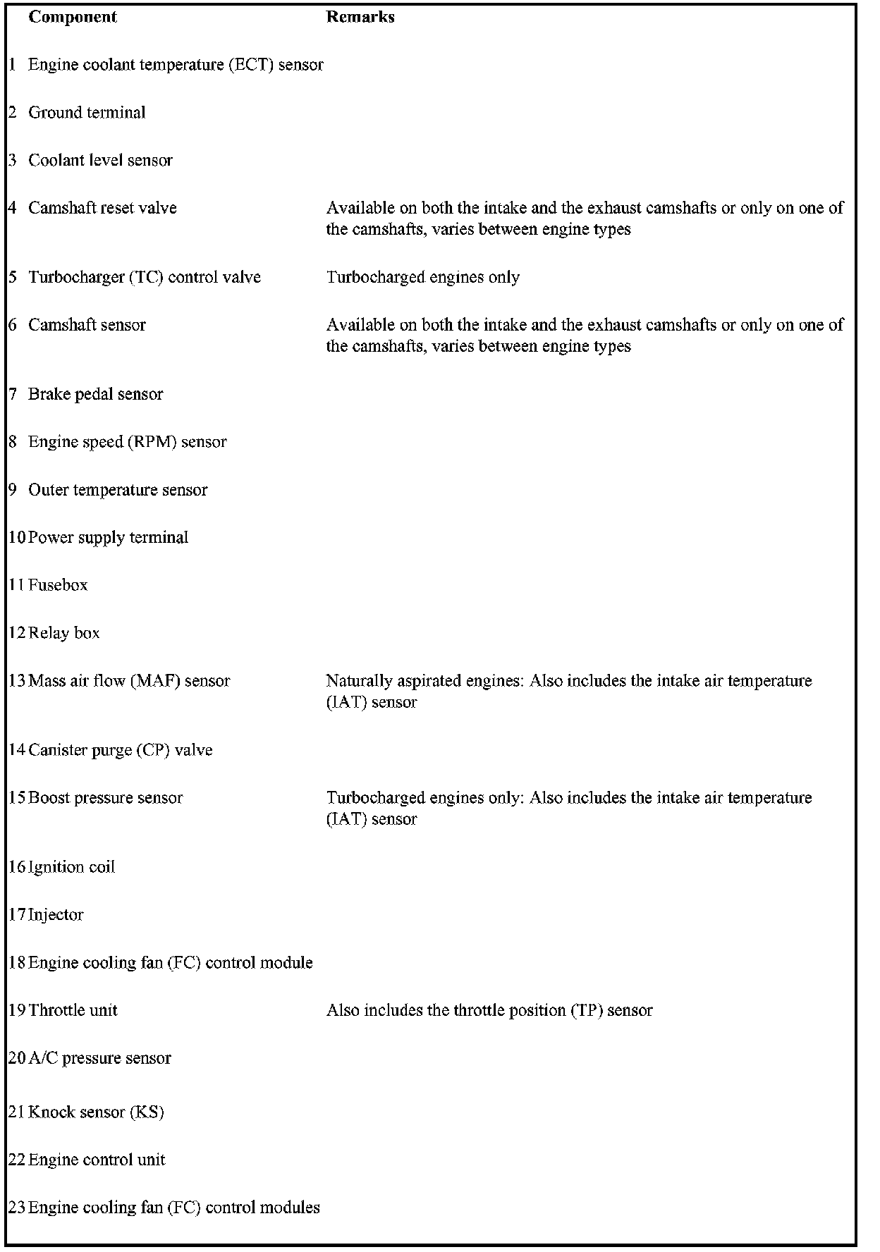 Not all the following components are necessarily in the car. The components vary between engine types.