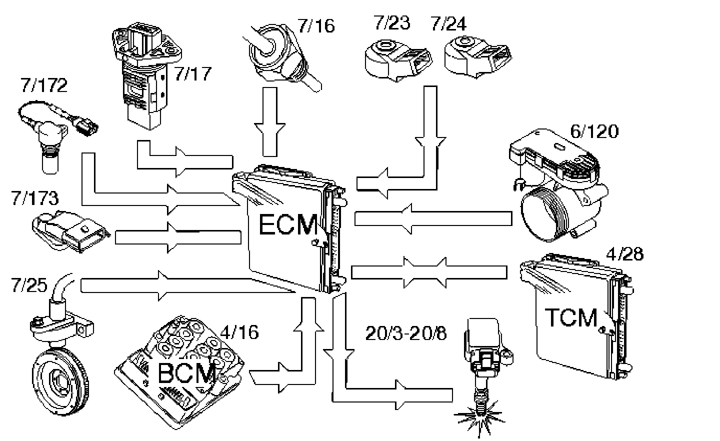 During the starting phase the engine control module (ECM) produces a fixed ignition setting. When the engine starts and the car is driven the engine control module (ECM) calculates the optimum ignition setting according to the engine speed (RPM), load, temperature etc.