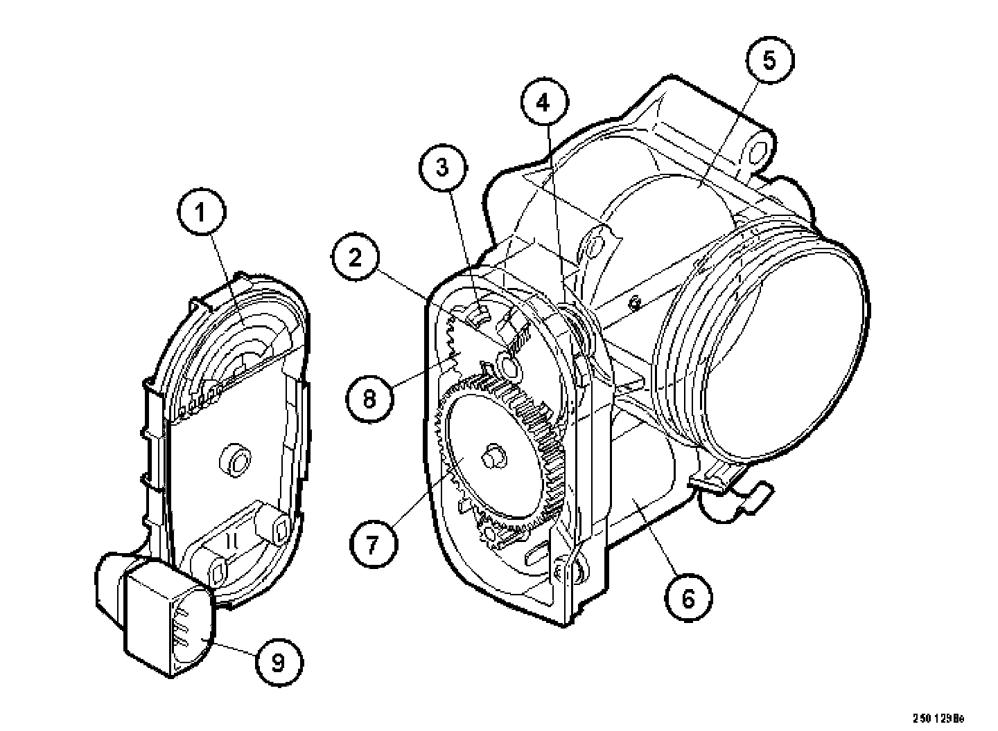 The electronic throttle unit consists of a round throttle disc on a shaft. This is turned using a DC motor (damper motor), gear wheel and two springs, an opening spring and a return spring. The damper motor is controlled by the engine control module (ECM) and is supplied with power by an integrated power stage in the control module. At one of the limit positions the throttle disc is closed so that no air can pass the throttle unit. At the other limit position the throttle disc is parallel to the air flow so that the air is able to freely pass through the throttle unit. The throttle disc shaft is mechanically connected to two built-in potentiometers (position sensors) which are supplied with power by the control module. The signals from the potentiometers provide the control module with data about the position of the throttle disc. The electronic throttle unit has a connector with six gold plated pins.