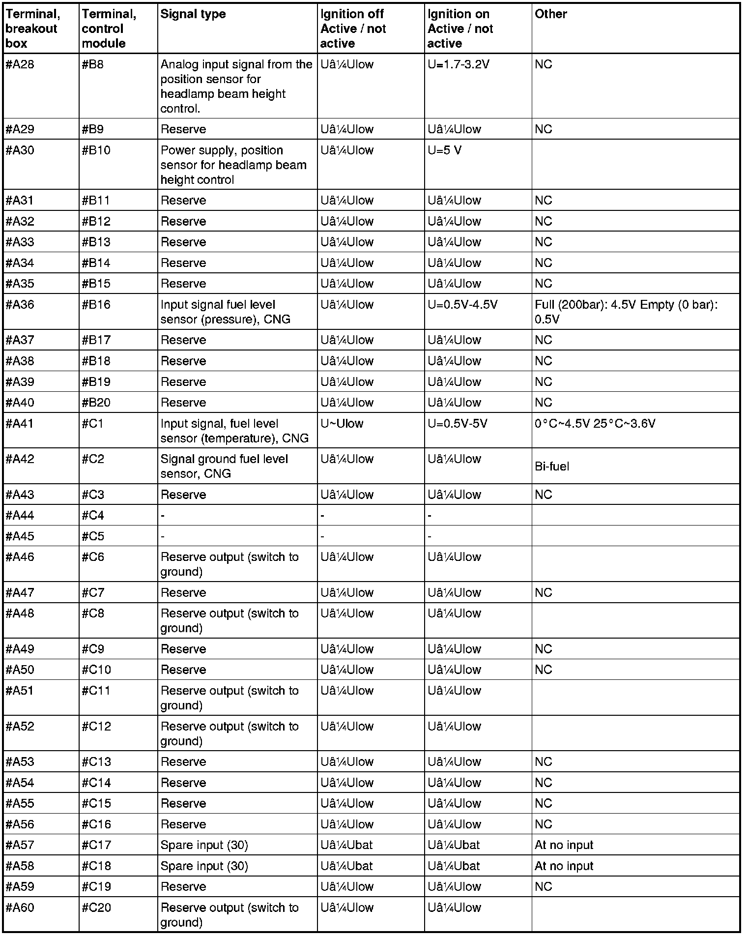 Connector A, terminals #A1-#A20