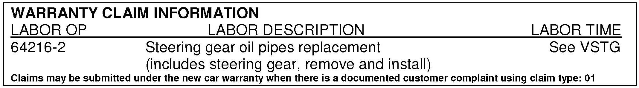 The procedure for removal and replacement of the oil pipes on the steering gear (rack) is missing in VIDA. These are not the power steering pressure and return hoses that route power steering fluid to and from the power steering pump/reservoir. These are the metal pipes on the steering gear itself. Also, a new clip has been implemented into production after chassis limits listed above to hold the pipes to the steering gear.