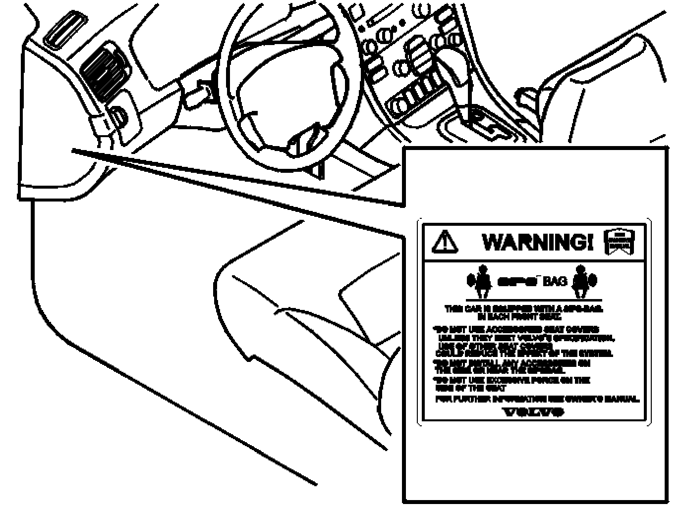 The decal warns against using seat covers that do not meet Volvo specifications for the front seats.
